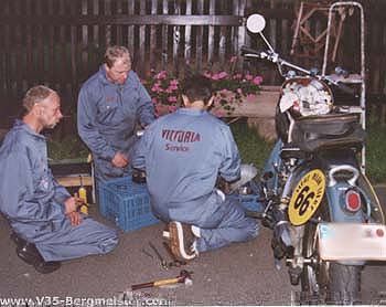Keine zwei Kilometer weiter der erste außerplanmäßige Stopp, nachfolgend von den Teilnehmern "Technischer Halt" genannt.. Peter Keller wechselt die rechte Zündkerze beim Kilometerstand 55 nach Abschluss seiner Restaurierungsarbeit, es soll die längste Probefahrt seines Lebens werden. Wenige Kilometer weiter installiert Peter einen Benzinfilter und nach der Vergaserreinigung haben die Fehlzündungen ein Ende. Wieder einige Kilometer weiter, die Distanzen werden schon länger, verabschiedet sch der aufgepresste Nippel am Kupplungszug der Thesing-V35. Das Service-Team lötet fachmännisch einen neuen Nippel auf und weiter. In Hermeskeil stellt Uwe fest, das seine 26er den Batteriehalter in die Botanik verstreut hat. Damit der Akku die Fahrwerkschütteleien überlebt wird er mit Kabelbindern am Rahmen fixiert lakonischer Kommentar von Len Thesing: "Das Rennen hätten wir 1954 schon verloren bevor es richtig angefangen hat".
