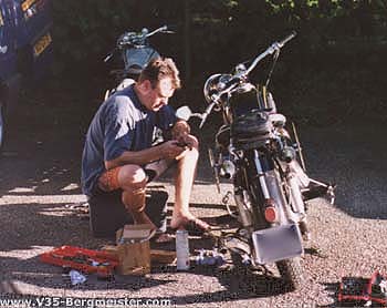 Die Sonne lacht, die Gashand erwacht, aber vorher wird an diesem Morgen an der Thesing- und an der Keller-V35 Inspektion gemacht. Schließlich ist bei der Keller-V35 die "Erstinspektion" längst überfällig. Start ist um 10.30 Uhr und genau eine Stunde später folgt der erste "technische Halt" des Tages, als bei der Stadtdurchfahrt von Meran an der Sprenger-V35 die Ladekontrolle wild aufflackert. Die Servicebus-Mannschaft, in der Person von Heiner wieder um 100 Prozent verstärkt, arbeitet sofort mit Hochdruck, und die Frage nach den originalen Victoria-Ersatzteilen wird wie immer mit dem Satz beantwortet: In irgendeiner von den grauen Kisten. Glücklicherweise musste keiner die fünf grauen Kisten durchwühlen, deren Packsystem bis zum Schluss der Tour keiner so richtig verstanden hat, denn der plötzliche Spannungsverlust kam von dem abgeschüttelten Kabel an Klemme 51, was nach dem Entfernen des Limadeckels sofort auffiel.